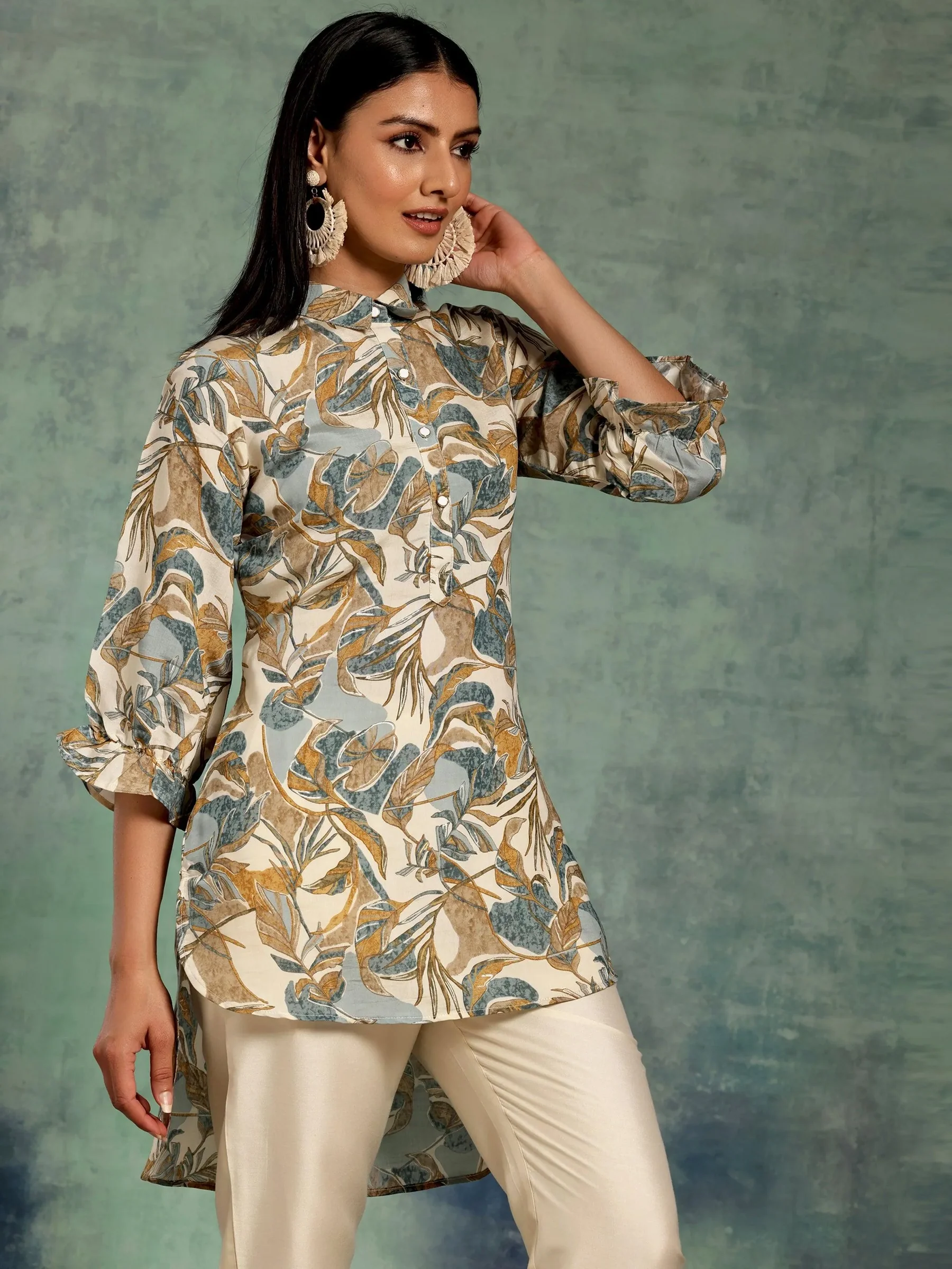 Beige Printed Silk Blend A-Line Kurti